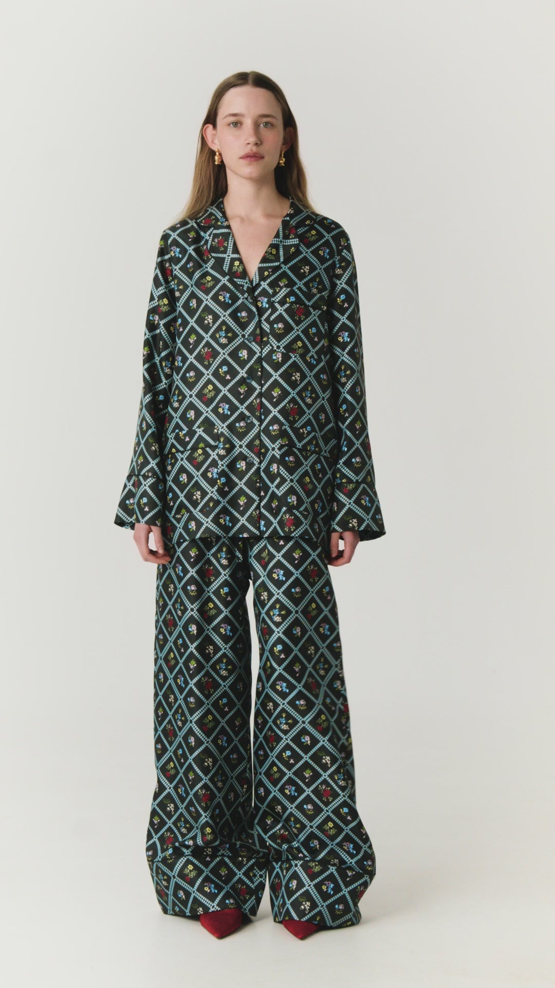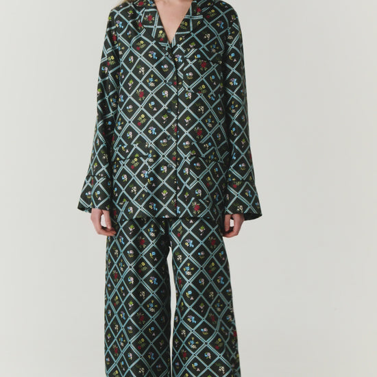 Шовкова сорочка з принтом Ружа в чорному. Патерн натхнений тканим килимом першої половини 19 ст. та брокарівською вишивкою. Силует сорочки відсилає до піжамної естетики, нагадує про мрійливість і легкість теплого сезону. Поєднуйте зі штанами та халатом Ружа в суцільний комплект, носіть з джинсами та спідницями у невимушених образах.