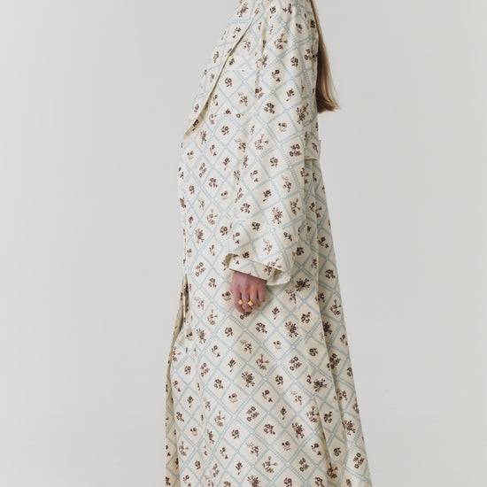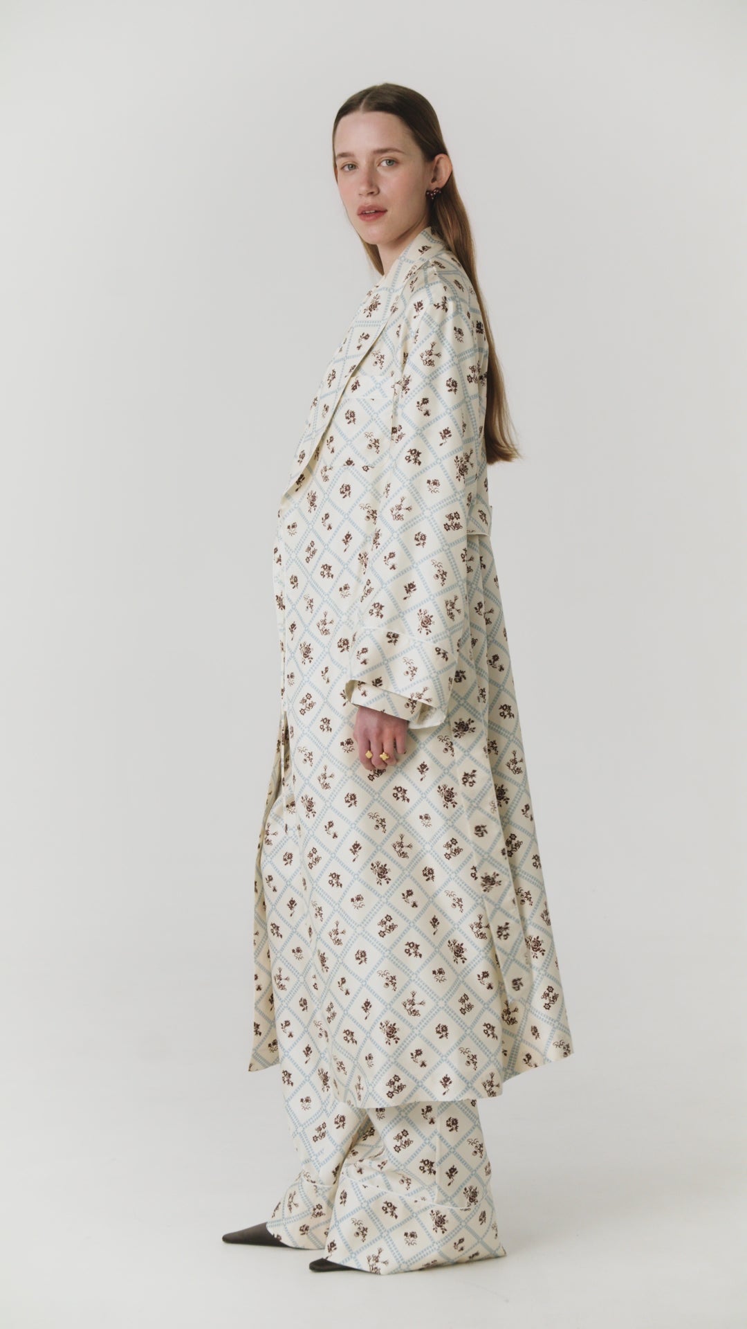 Шовкова сорочка з принтом Ружа в молочному. Патерн натхнений тканим килимом першої половини 19 ст. та брокарівською вишивкою. Силует сорочки відсилає до піжамної естетики, нагадує про мрійливість і легкість теплого сезону. Поєднуйте зі штанами та халатом Ружа в суцільний комплект, носіть з джинсами та спідницями у невимушених образах.