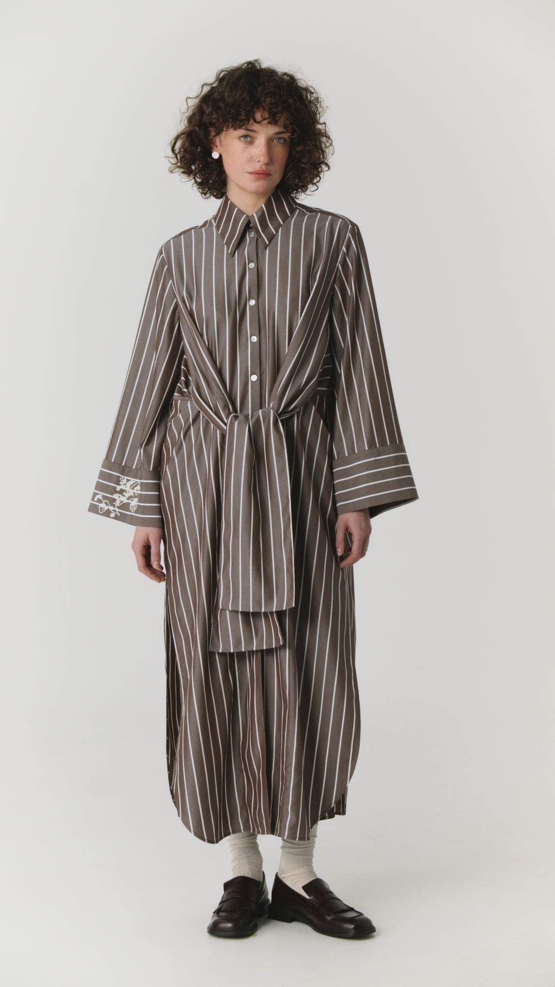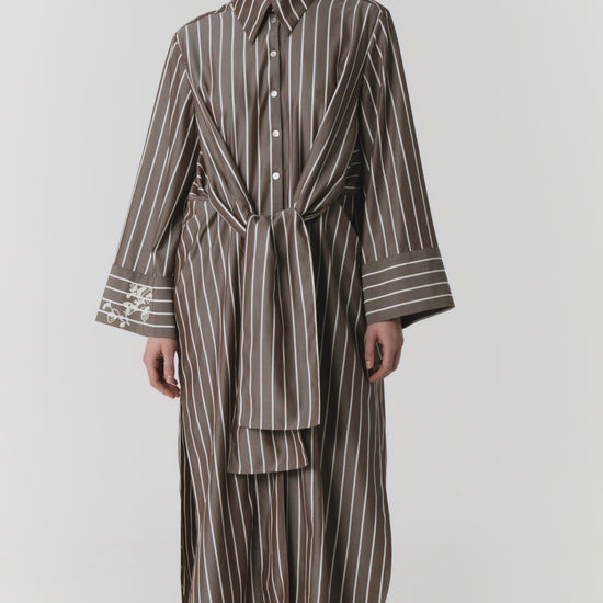 Сукня з зав’язками Марія. Елемент жіночого повсякденного чи святкового вбрання. Довжина максі, широкі манжети, вишите лого GUNIA. Сильний та водночас м’який силует відповідає канонам класики й вимогам сучасного стилю життя. Виріб оздоблено широкими зав’язками на поясі та логотипом GUNIA, що інтерпретує традицію вишивки хрестиком. Носіть у повсякденні міста та новизні подорожей, використовуйте як універсальний предмет гардероба з українським характером.